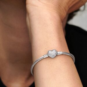 Добавьте блеска и романтики вашим чарам с этой потрясающей версией культового браслета-змейки Pandora. Этот элегантный браслет, выполненный вручную из стерлингового серебра, имеет двустороннюю застёжку в форме сердца с мерцающим паве с одной стороны и тиснёным логотипом Pandora с другой. Просто поверните застёжку, чтобы создать два разных образа. Носите этот браслет без украшений или дополните любимыми шармами Pandora.